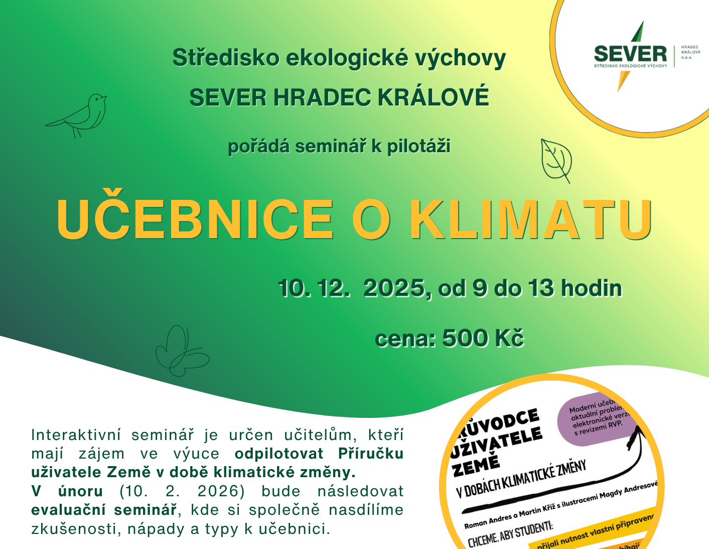 Seminář pro učitele 2. stupňů základních škol a středních škol, zaměřený na praktické představení nové učebnice ke změně klimatu.